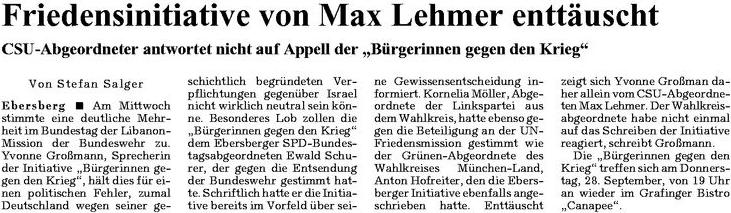 Ebersberger Süddeutsche Zeitung vom 23.09.2006 Anmerkung: Nach Auskunft des Berliner Büros des CSU-Bundestagsabgeordneten Dr. Max Lehmer hat er als einziger der fünf von uns angeschriebenen Bundestagsabgeordneten den Brief nicht erhalten und deshalb nicht reagieren können. Wir bedauern das Missverständnis und haben uns dafür bei ihm entschuldigt. Auf unseren Vorschlag, die Sachlage mit einer gemeinsamen Presseerklärung aufzuklären, ging er leider nicht ein.