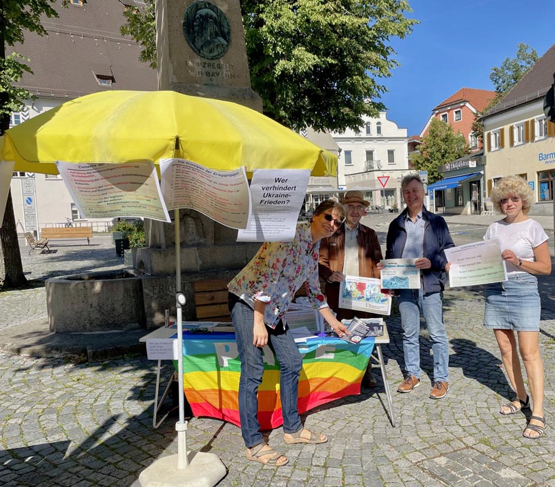 Anlässlich des Weltfriedenstages veranstaltete die Friedensgruppe "BürgerInnen gegen den Krieg (Landkreis Ebersberg)" auf dem Ebersberger Marienplatz einen Info-Stand. Hauptthema war die sofortige Aufnahme von Friedensverhandlungen zwischen Russland und der Ukraine, um schnellstmöglich zu einem gerechten und dauerhaften Frieden zu kommen. Dieser kann nur möglich sein, wenn dabei den berechtigten Sicherheits- und anderen Interessen aller beteiligten Staaten und Volksgruppen Rechnung getragen wird. Dass Waffenlieferungen nur zur Verlängerung des Krieges und des Leides führen, beweist die Entwicklung des Krieges seit eineinhalb Jahren auf tragische Weise. Nicht zuletzt fehlt das für die horrenden Kriegs- und Aufrüstungskosten buchstäblich verpulverte Geld auch in den nicht direkt vom Krieg betroffenen Ländern überall in den öffentlichen Haushalten, so im Bildungs- und Gesundheitswesen oder bei der Bewältigung der Klimakrise und deren sozialer Abfederung. In intensiven Gesprächen mit Passantinnen und Passanten, auch über die Vorgeschichte und die Hintergründe des Krieges, wurde deutlich, dass weite Teile der Bevölkerung das ebenso sehen.